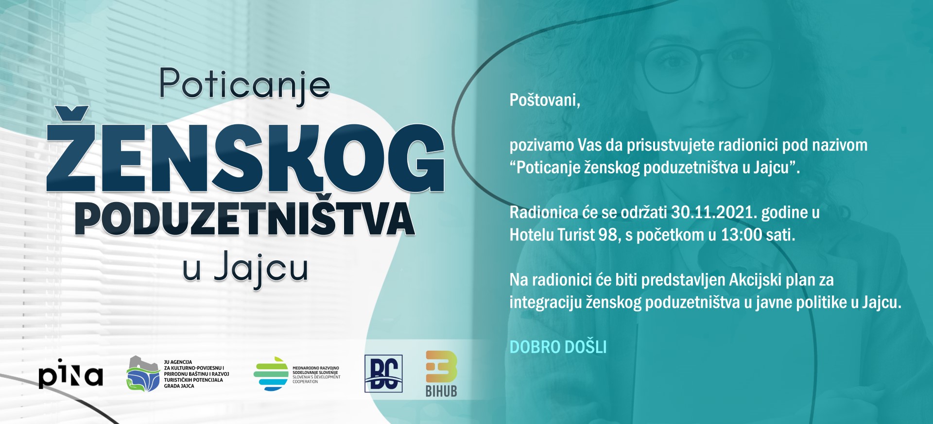 U Utorak, 30.11.2021. godine u prostorijama Hotela Turist 98, sa početkom u 13h, održat će se radionica „Poticanje ženskog poduzetništva u Jajcu“, na kojoj će biti predstavljen Akcioni plan za integraciju ženskog poduzetništva u javne politike.